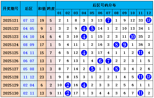 跨度分析:上期后区跨度为9,与前期相比上升7个点位,预测本期跨度走势波动下降,推荐两码跨度1--5