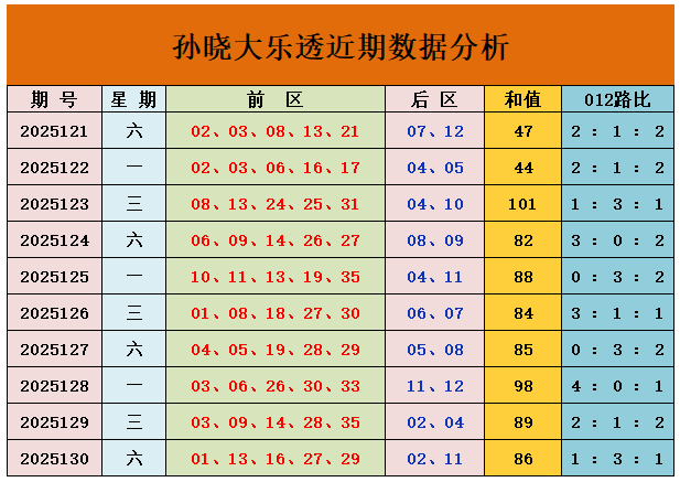 上期回顾:大乐透第2025130期奖号:前区01、13、16、27、29,后区02、11,前区奖号和值为86,三区比为1:2:2,后区开出小大组合02、11